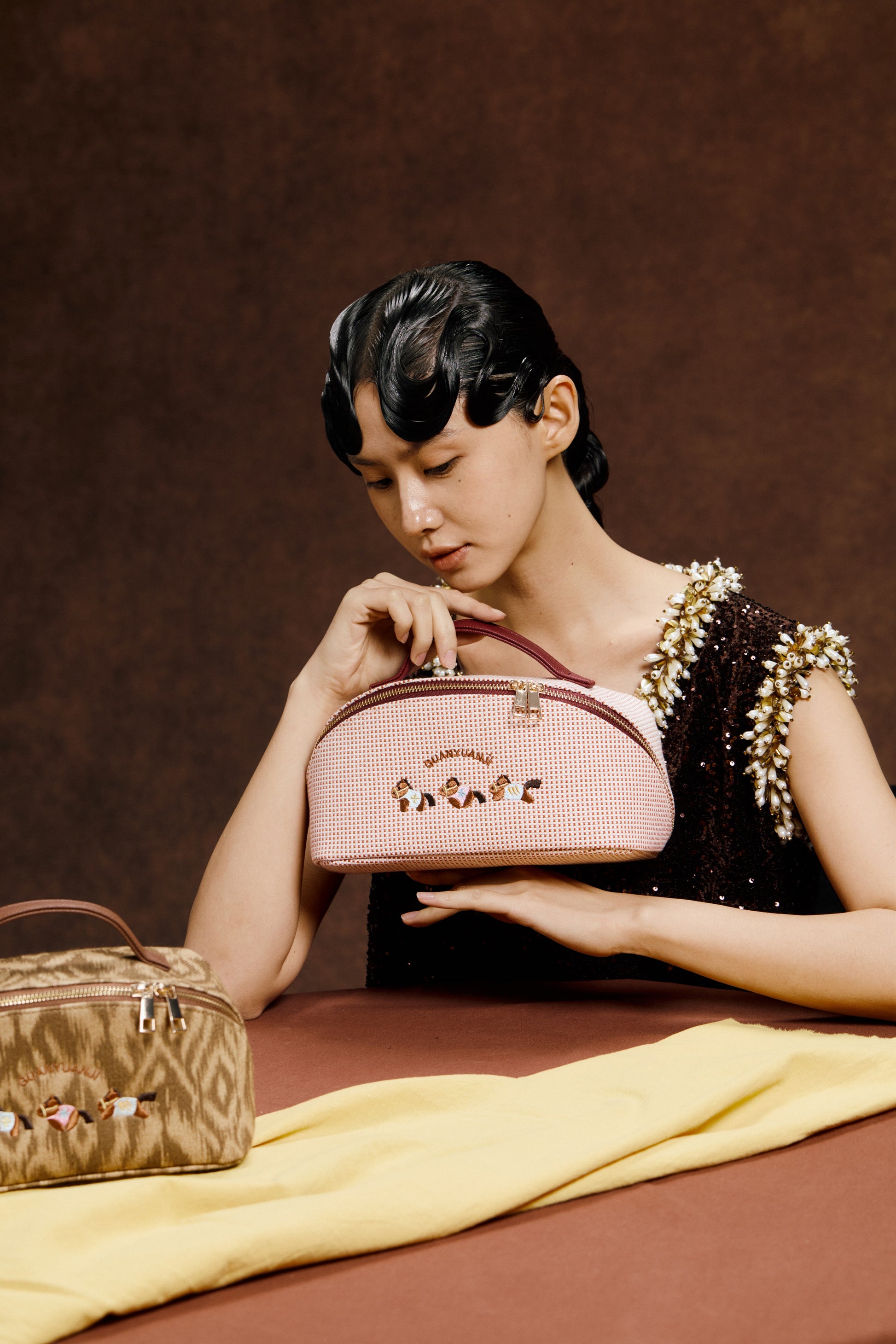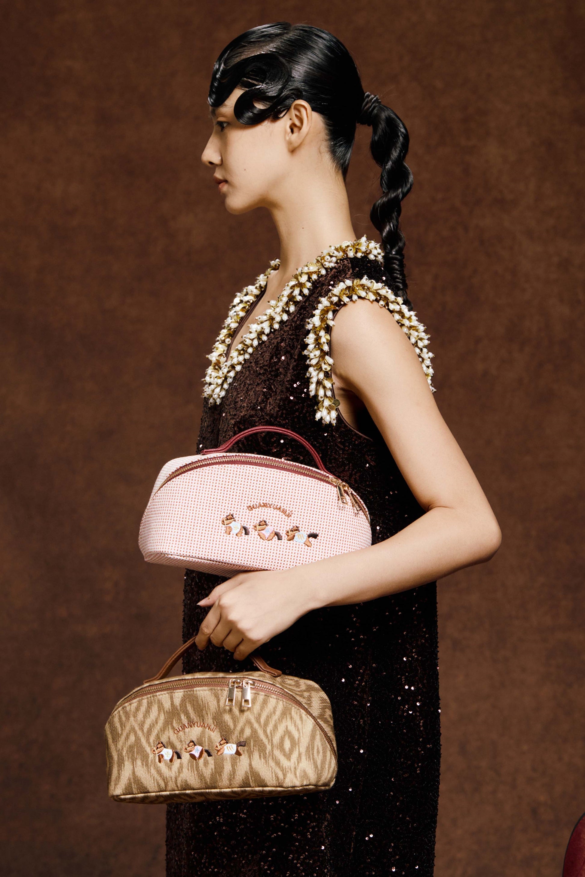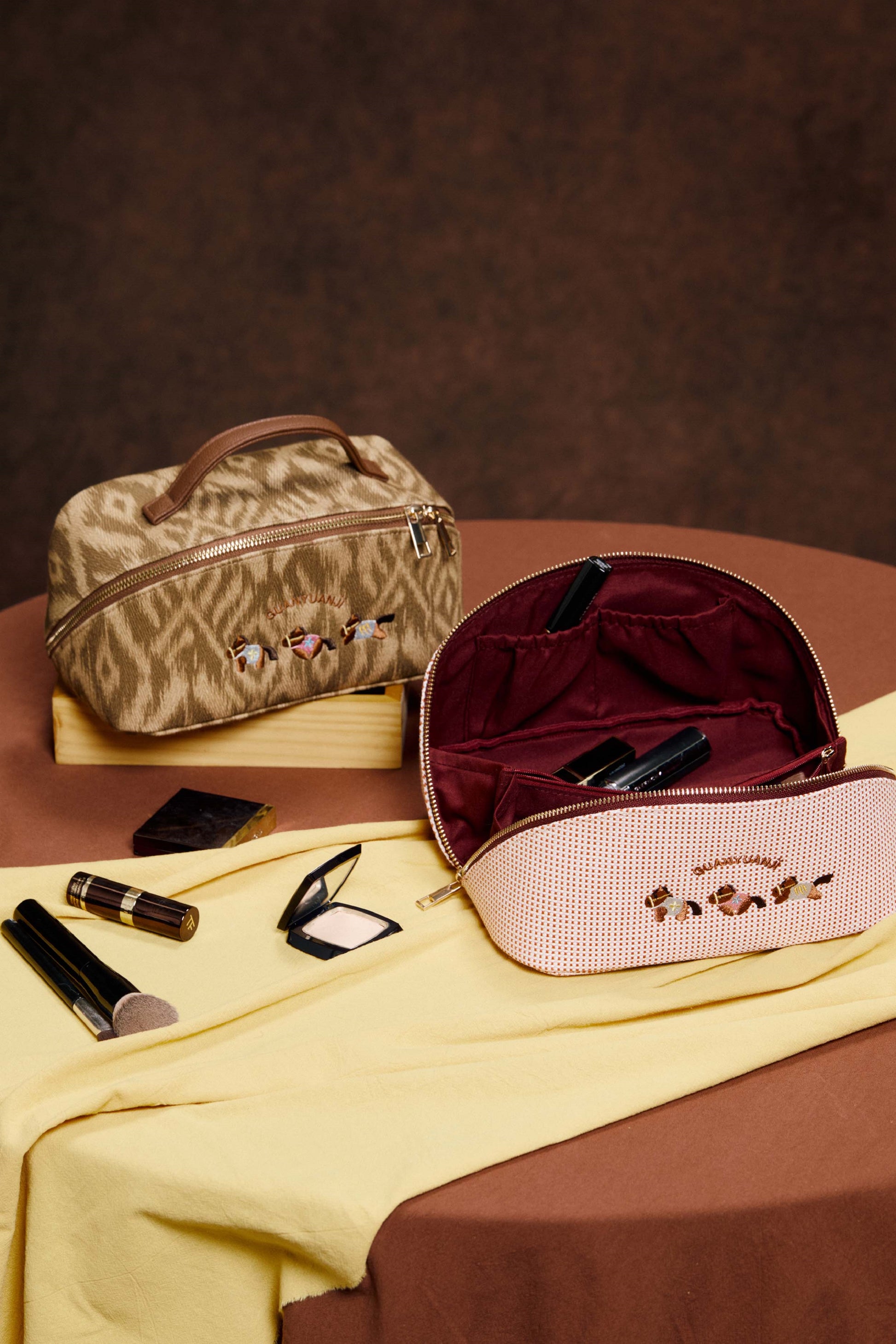 Exclusive custom embroidered pattern of galloping ponies—seamlessly blending traditional embroidery craftsmanship with modern design. it accompanies you on every journey, turning your daily grooming routine into a delightful surprise.